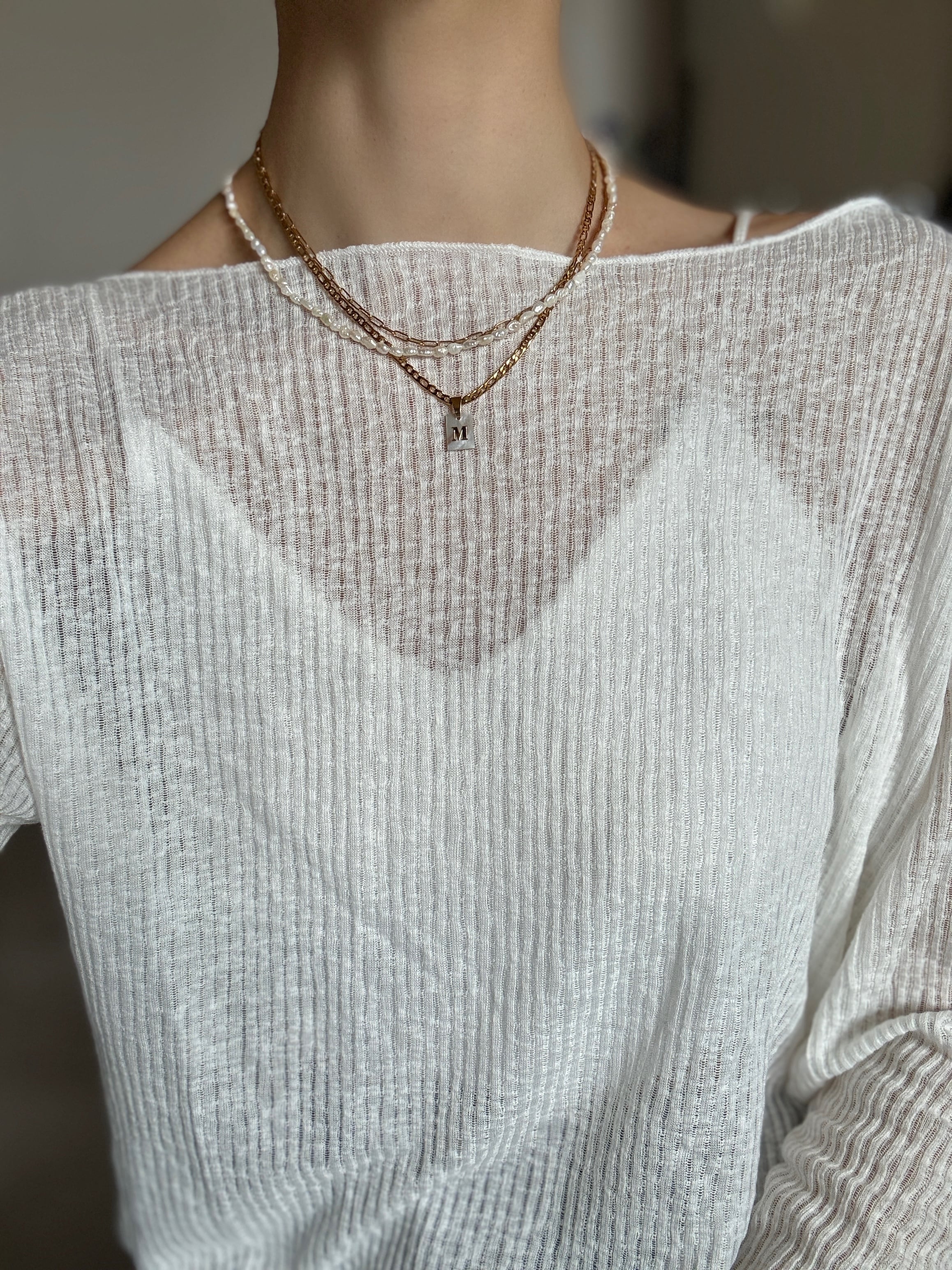 華奢すぎず、太すぎない密度のあるゴールドチェーンを合わせて、さりげなくも存在感のある仕上がりに。