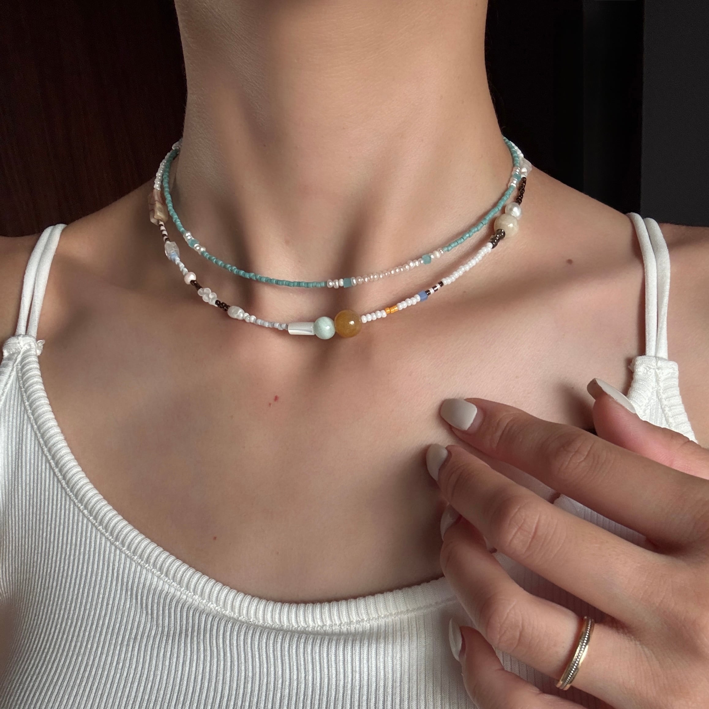 夏らしさの中にも、ほんの少しの落ち着きを感じられるネックレスです。