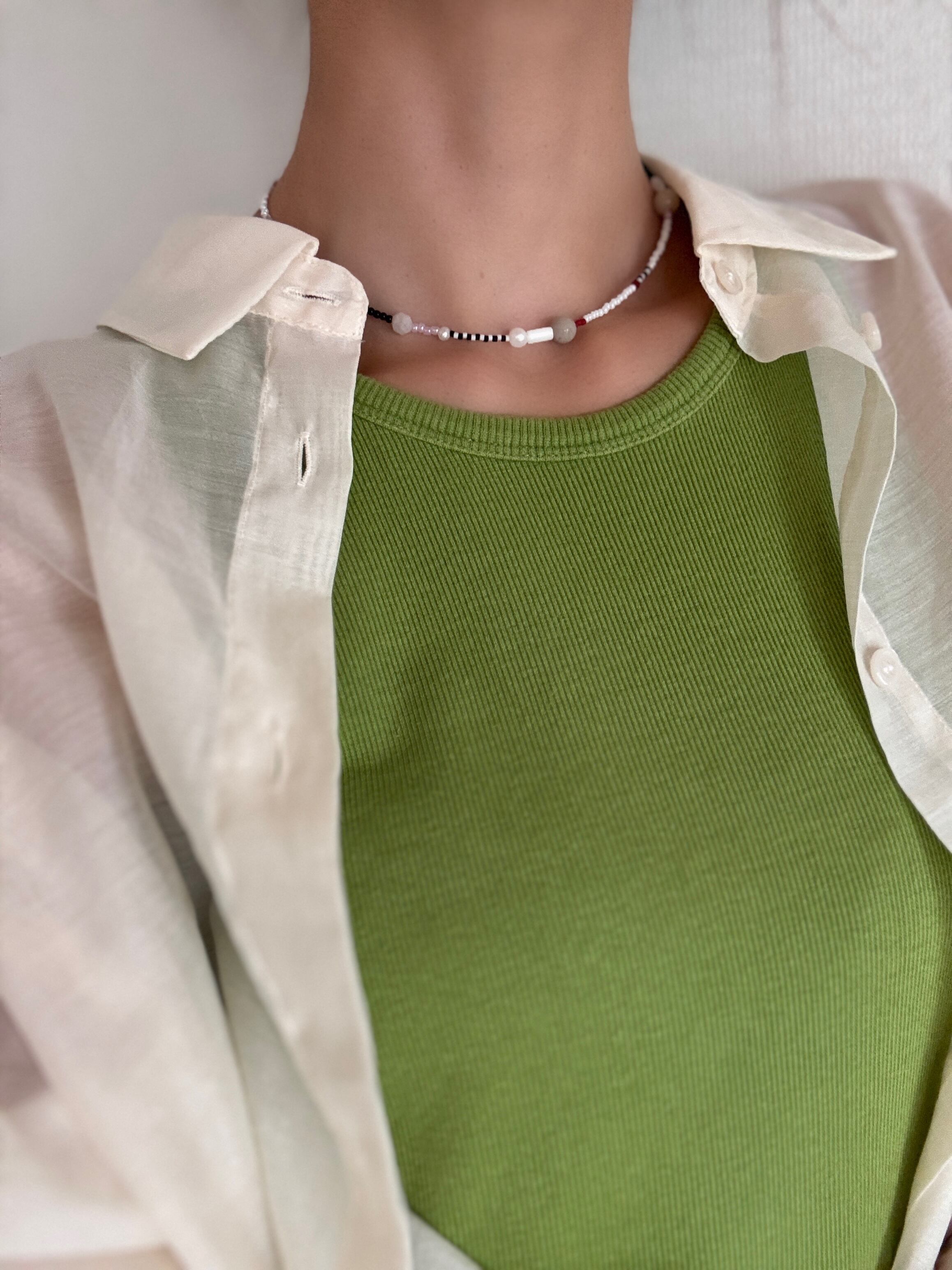 モノトーンの中に少しだけ赤を効かせた、潔くてしなやかなネックレス。
