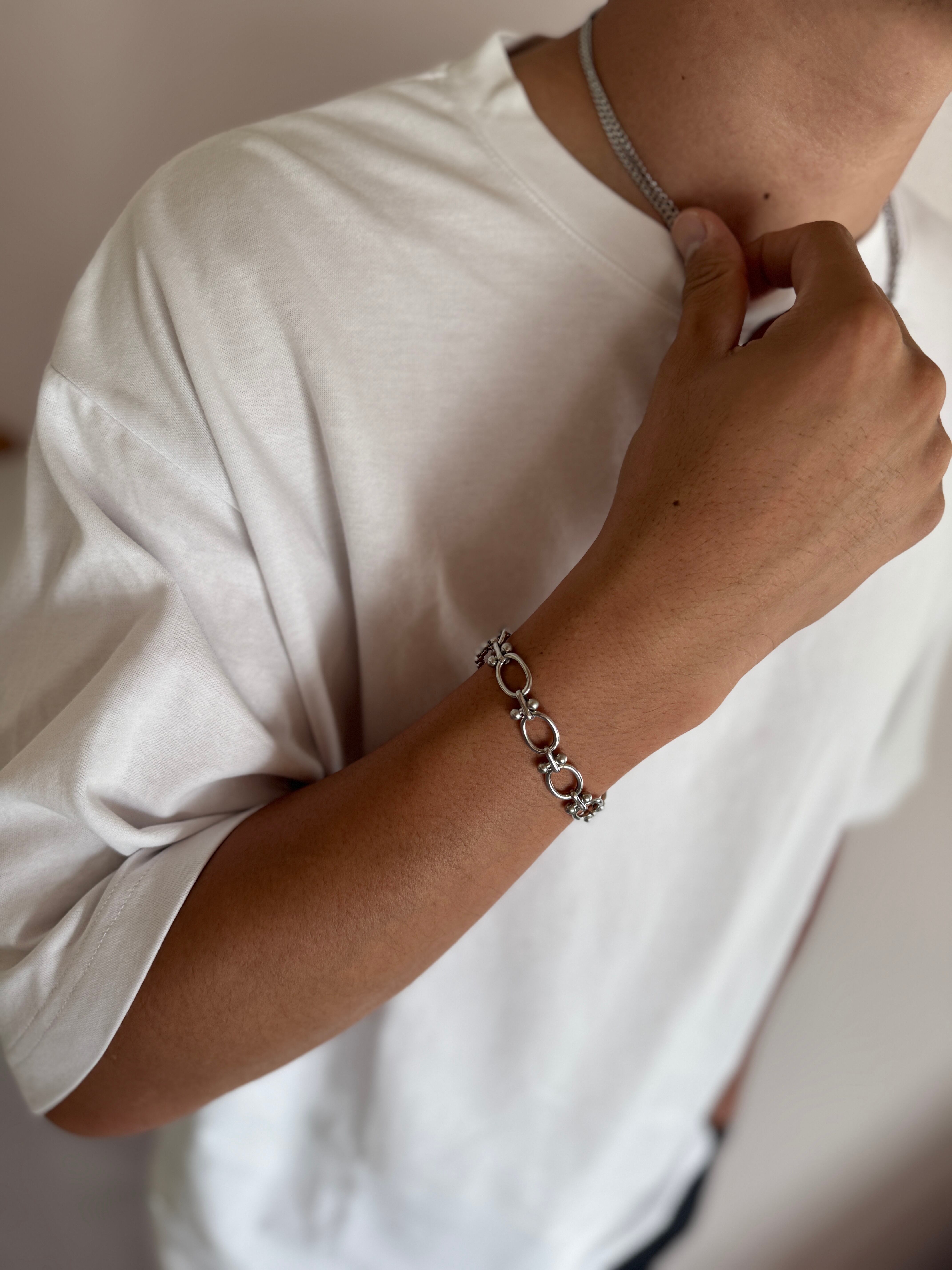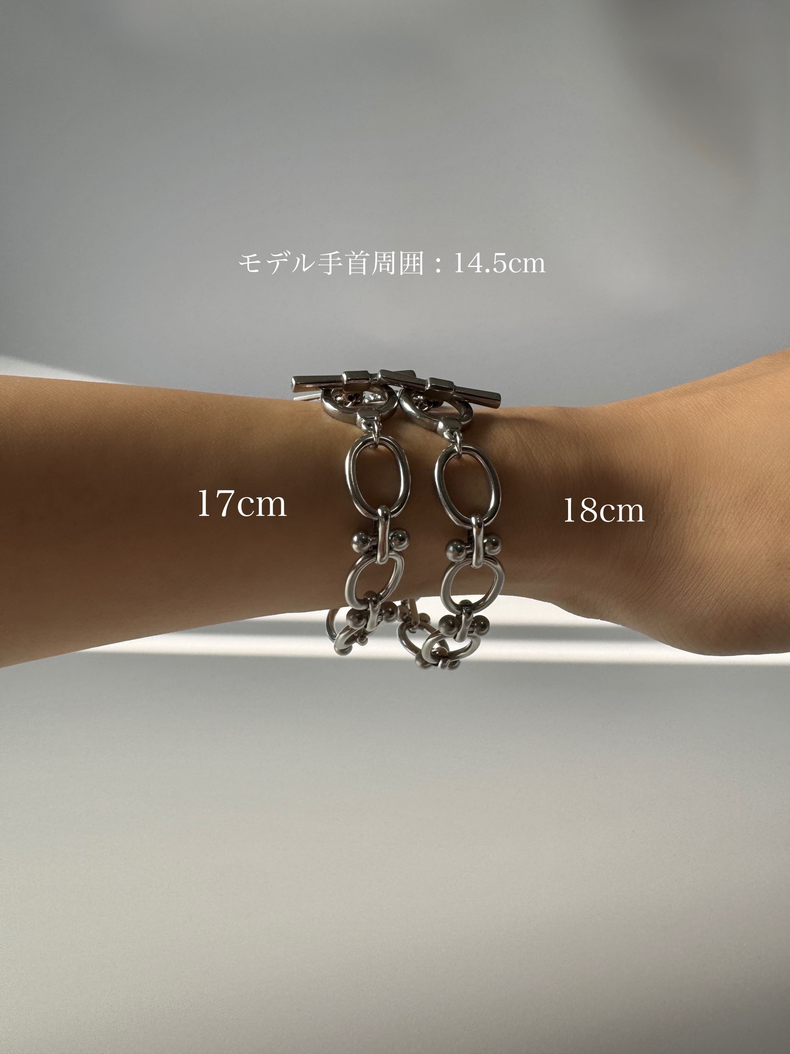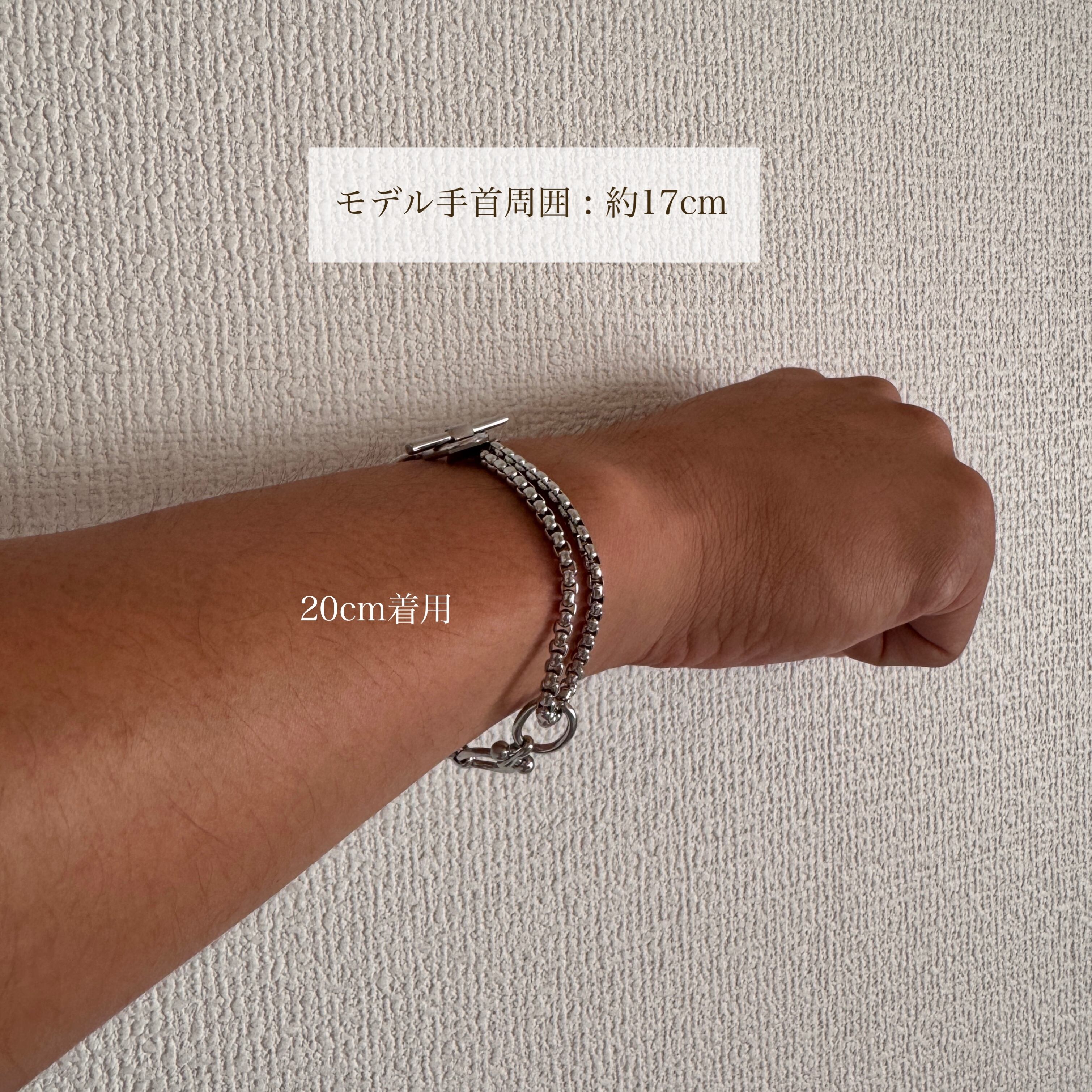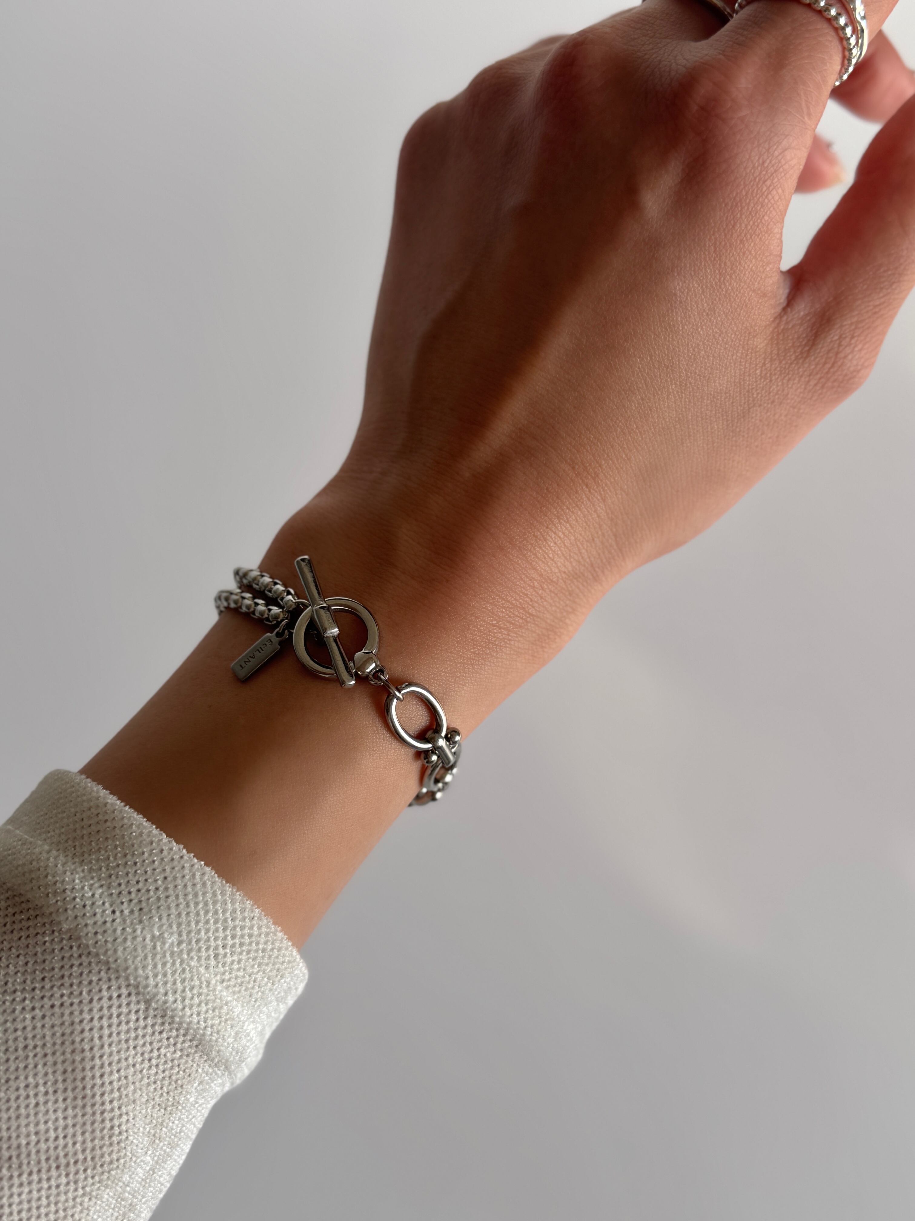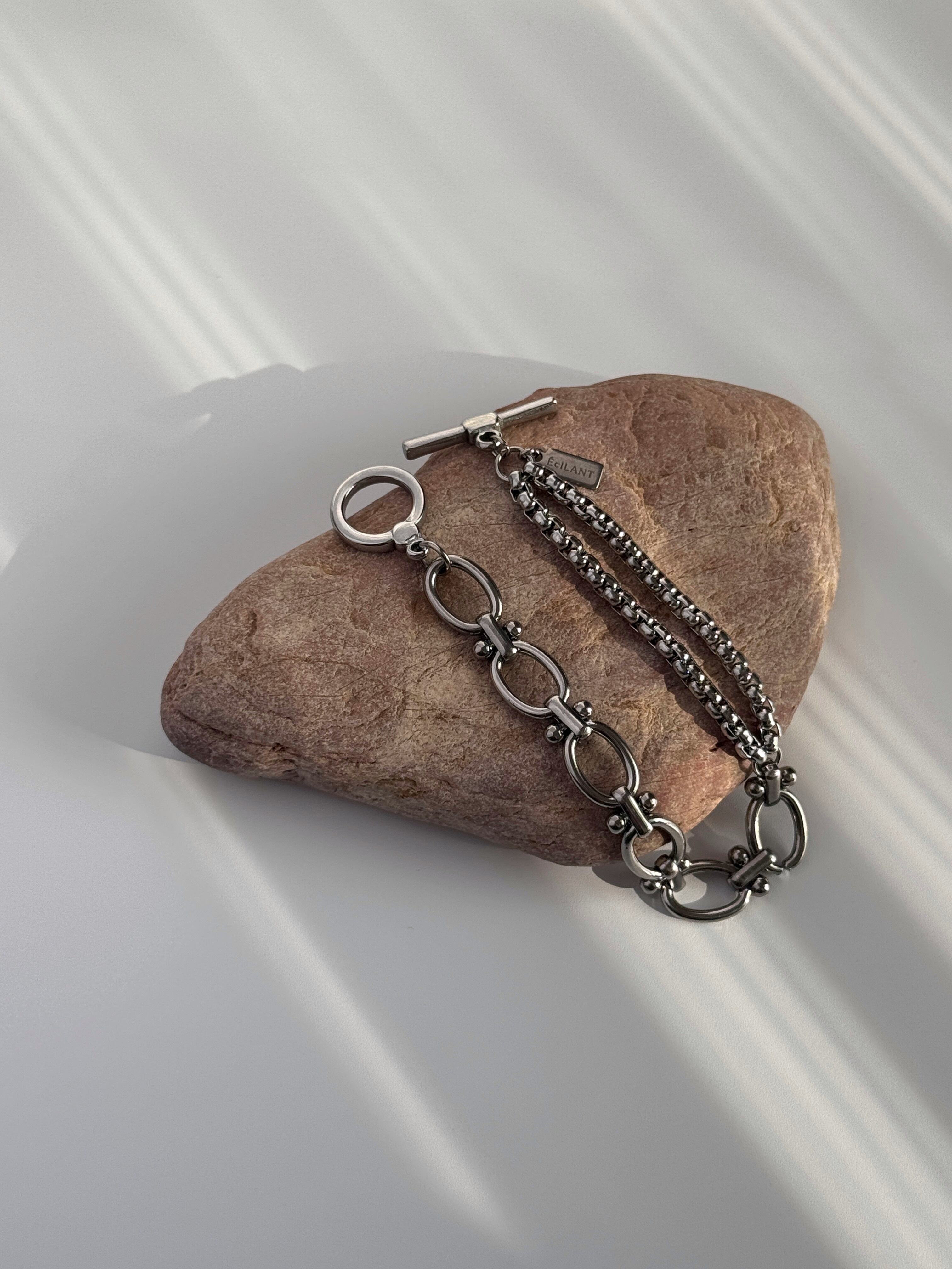 2種類のステンレスチェーンを連ねた、表情豊かなブレスレット。