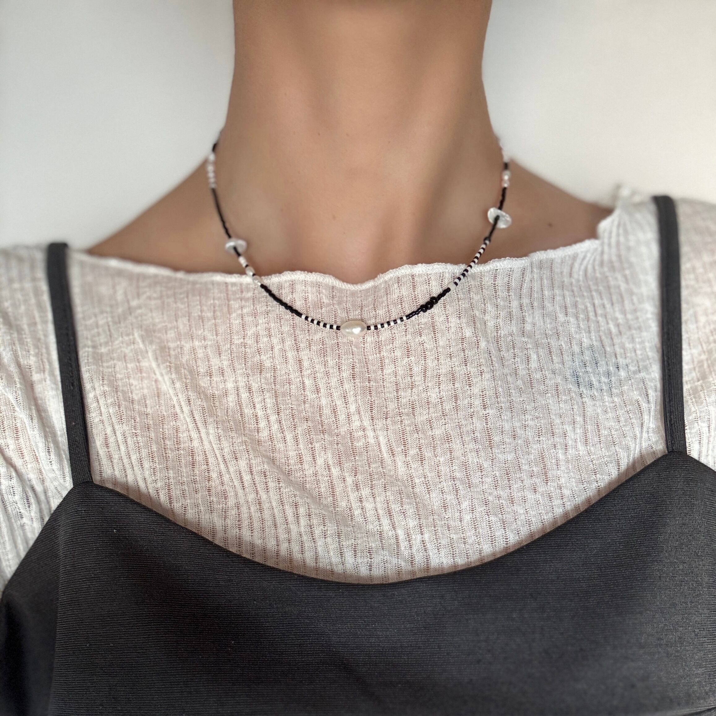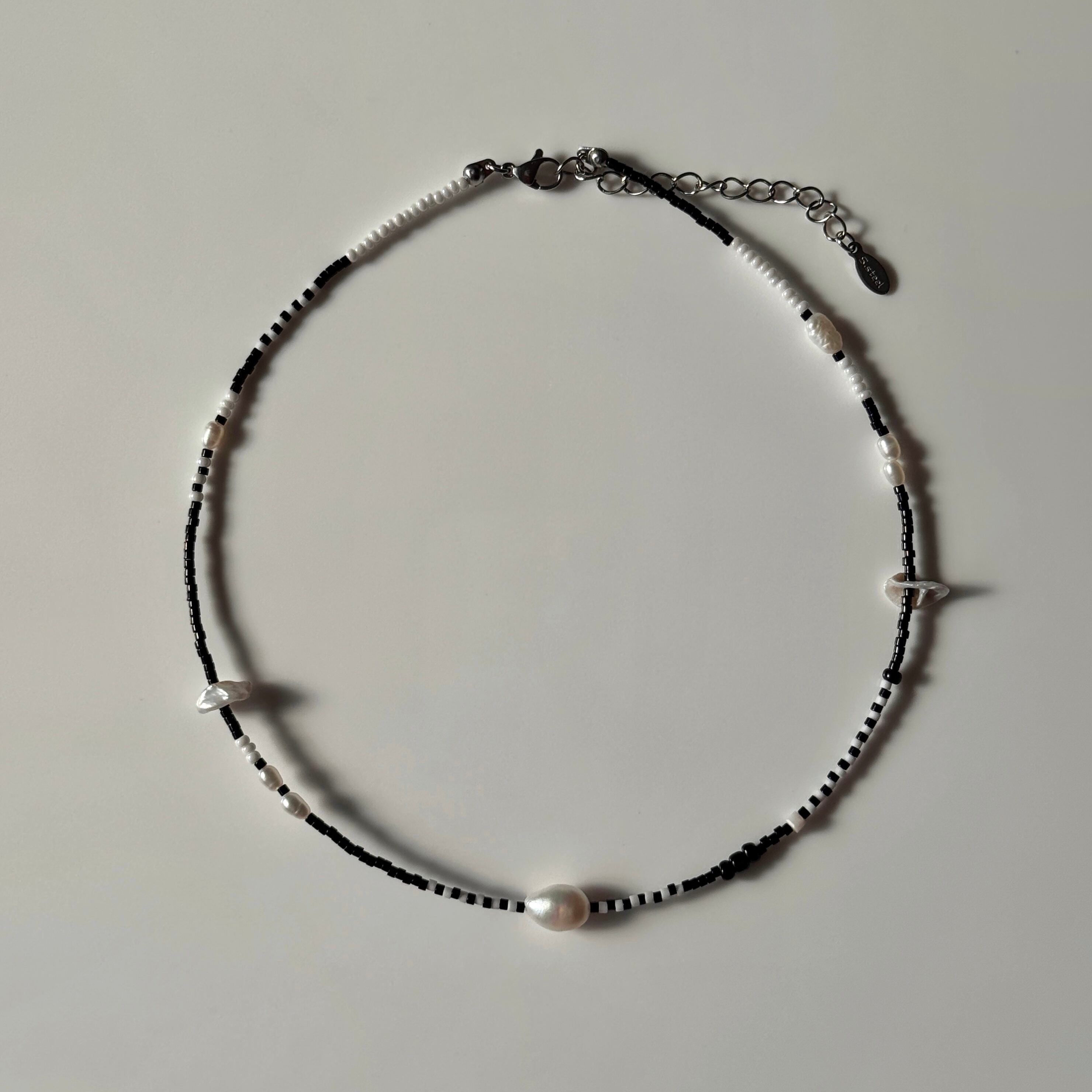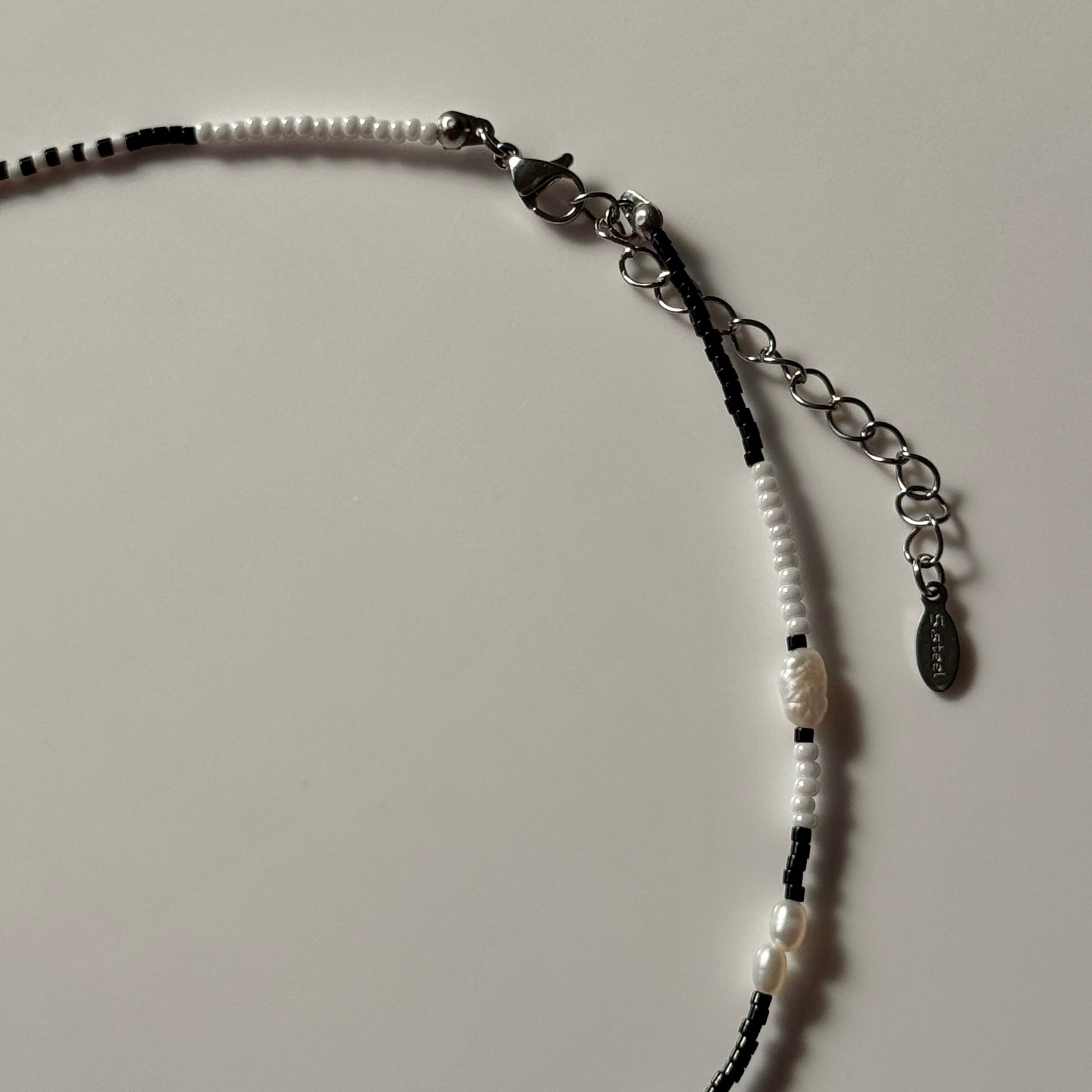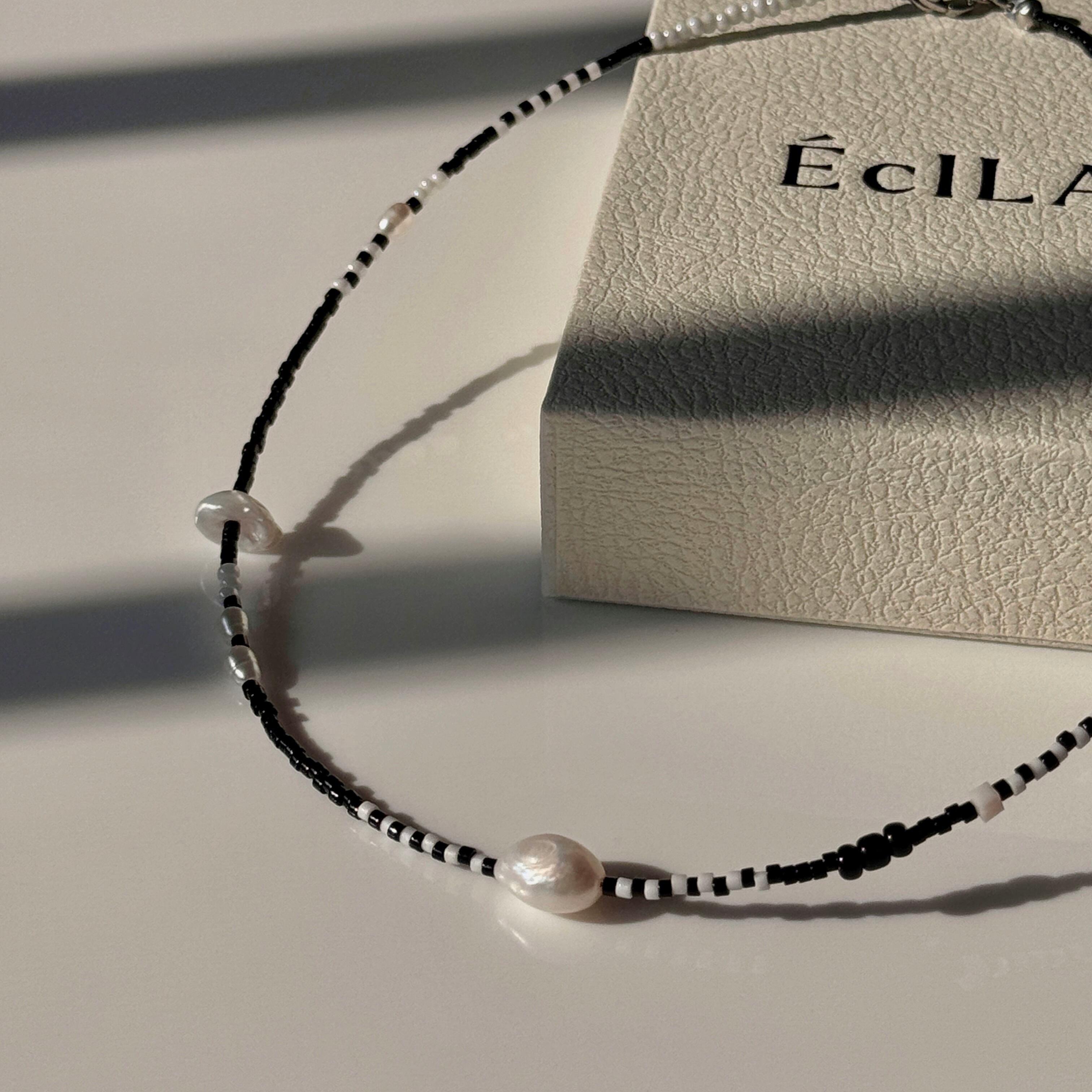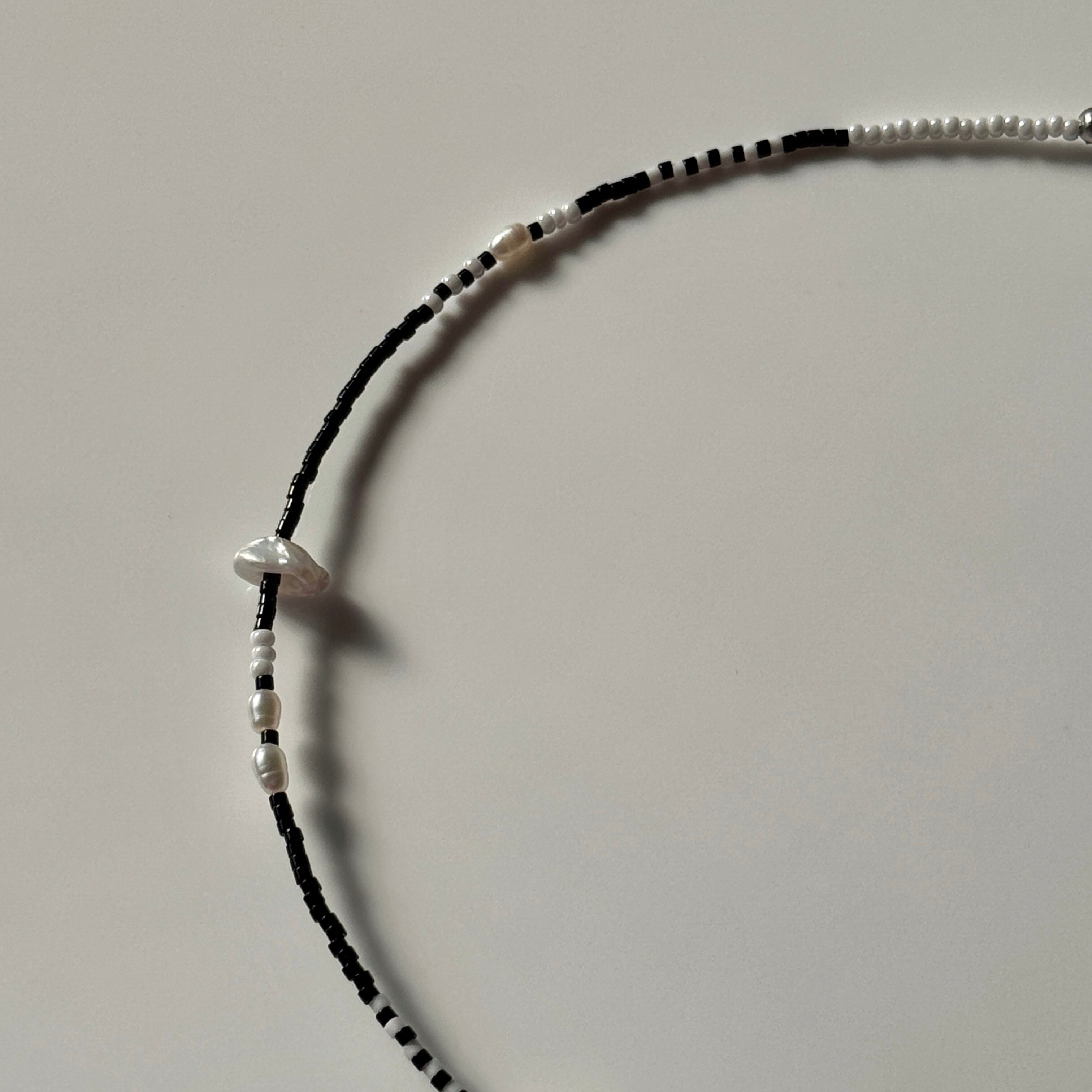 ブラックとホワイト、コントラストの美しいモノトーンビーズに、柔らかな光を宿した淡水パールをあしらったネックレス。