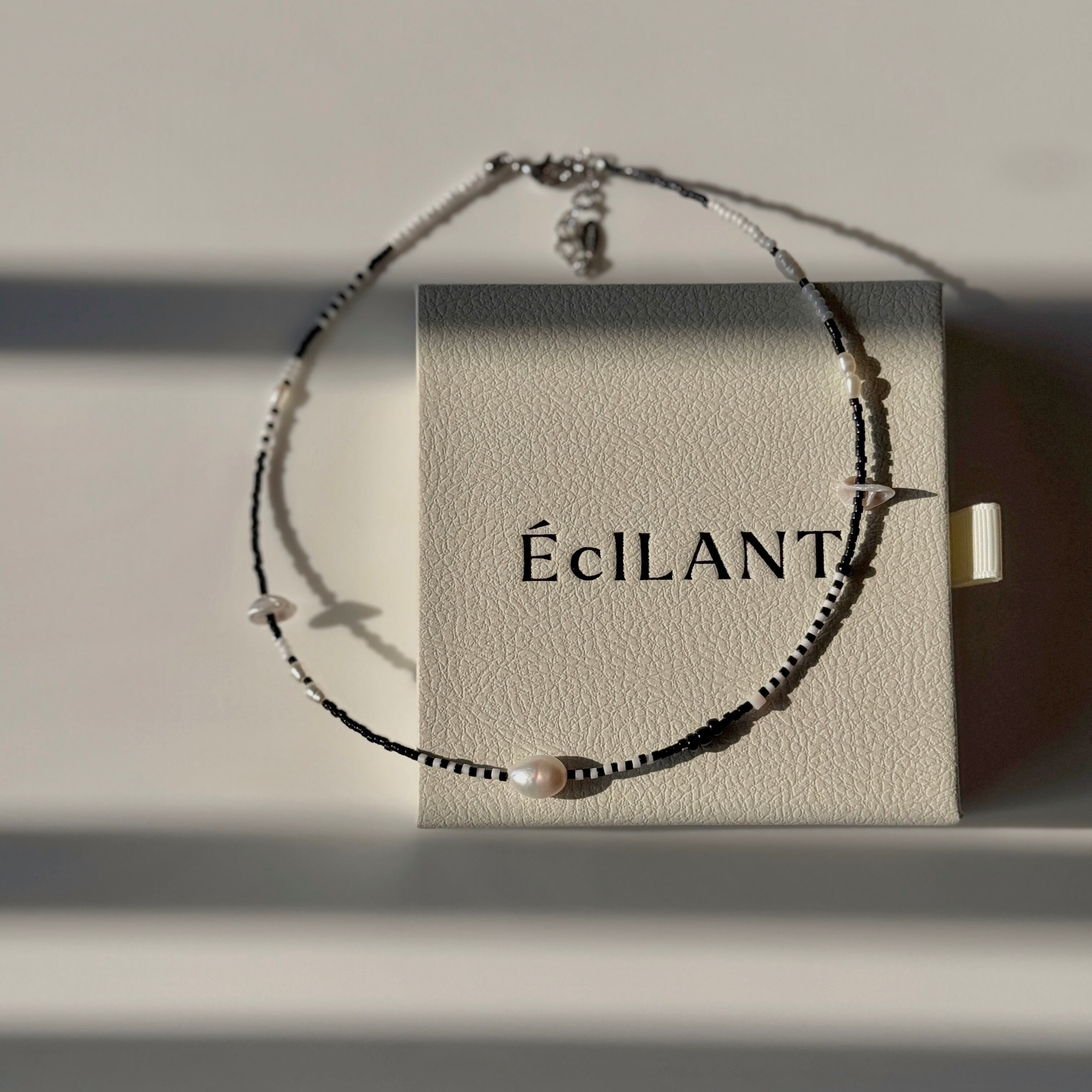 ミニマルな配色ながらも、リズム感のあるビーズの並びがスタイリングに軽やかなアクセントを添えてくれます。