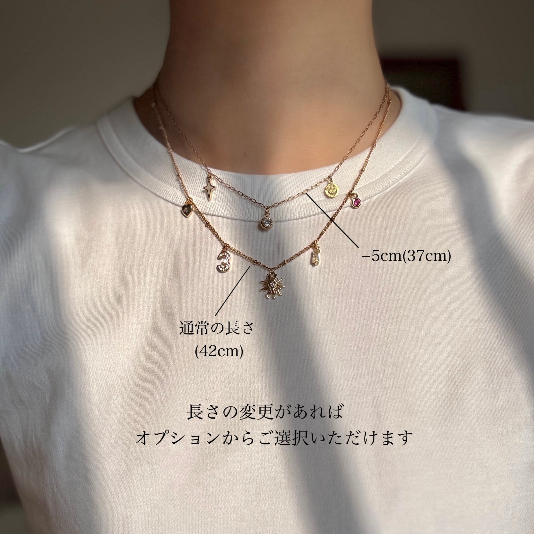 1・3・5個など奇数個のチャームをランダムに選んで、首元にリズム感をプラス。