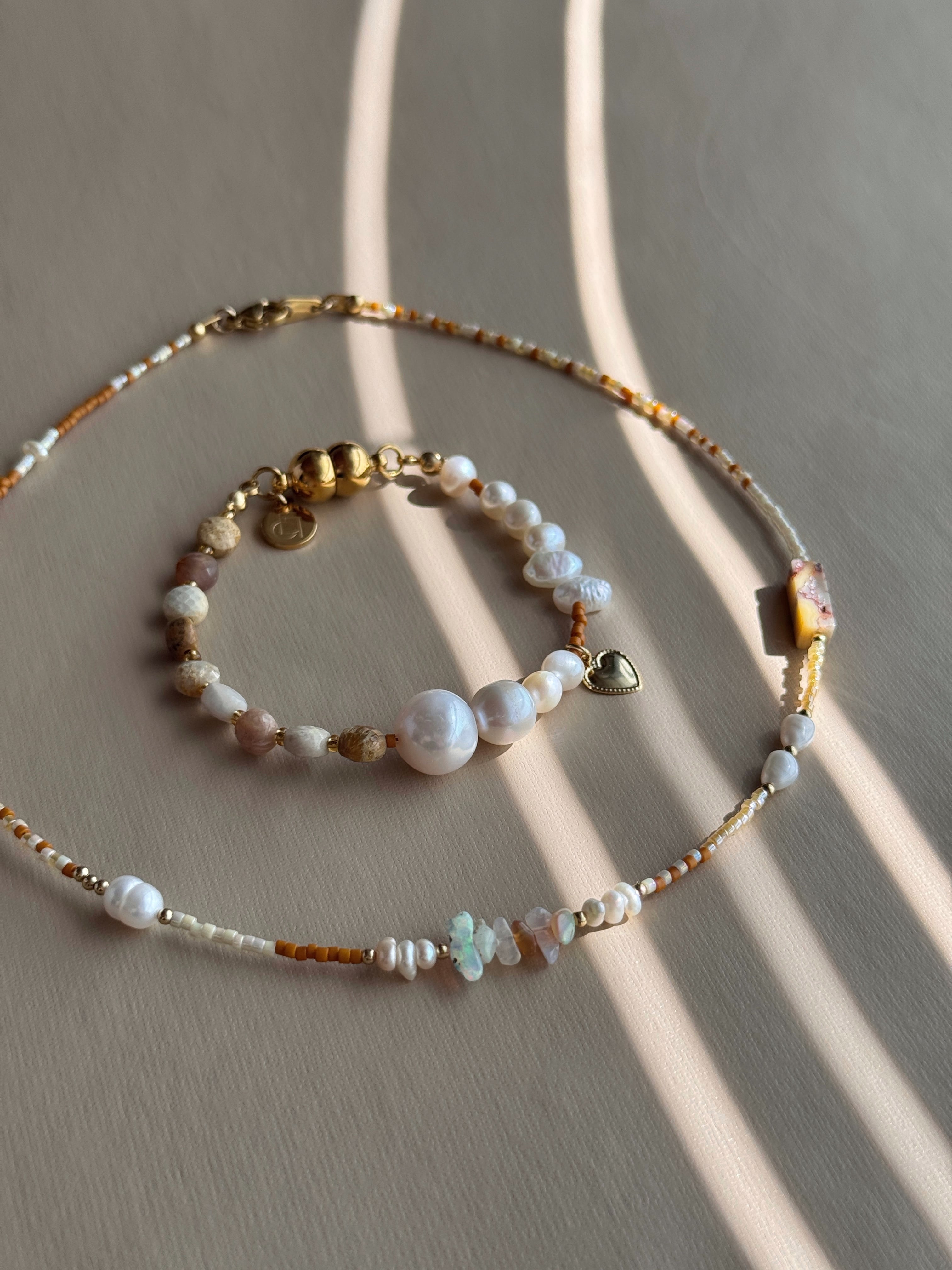 ナチュラルな模様が特徴的なフォシルコーラル(化石珊瑚)と異なるサイズの淡水パールを組み合わせ、自然のリズムを感じるようなバランスに仕上げました。