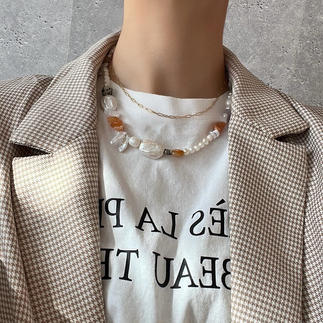 力強く華美な雰囲気の中にフェミニンさも兼ね備えたパールネックレス。