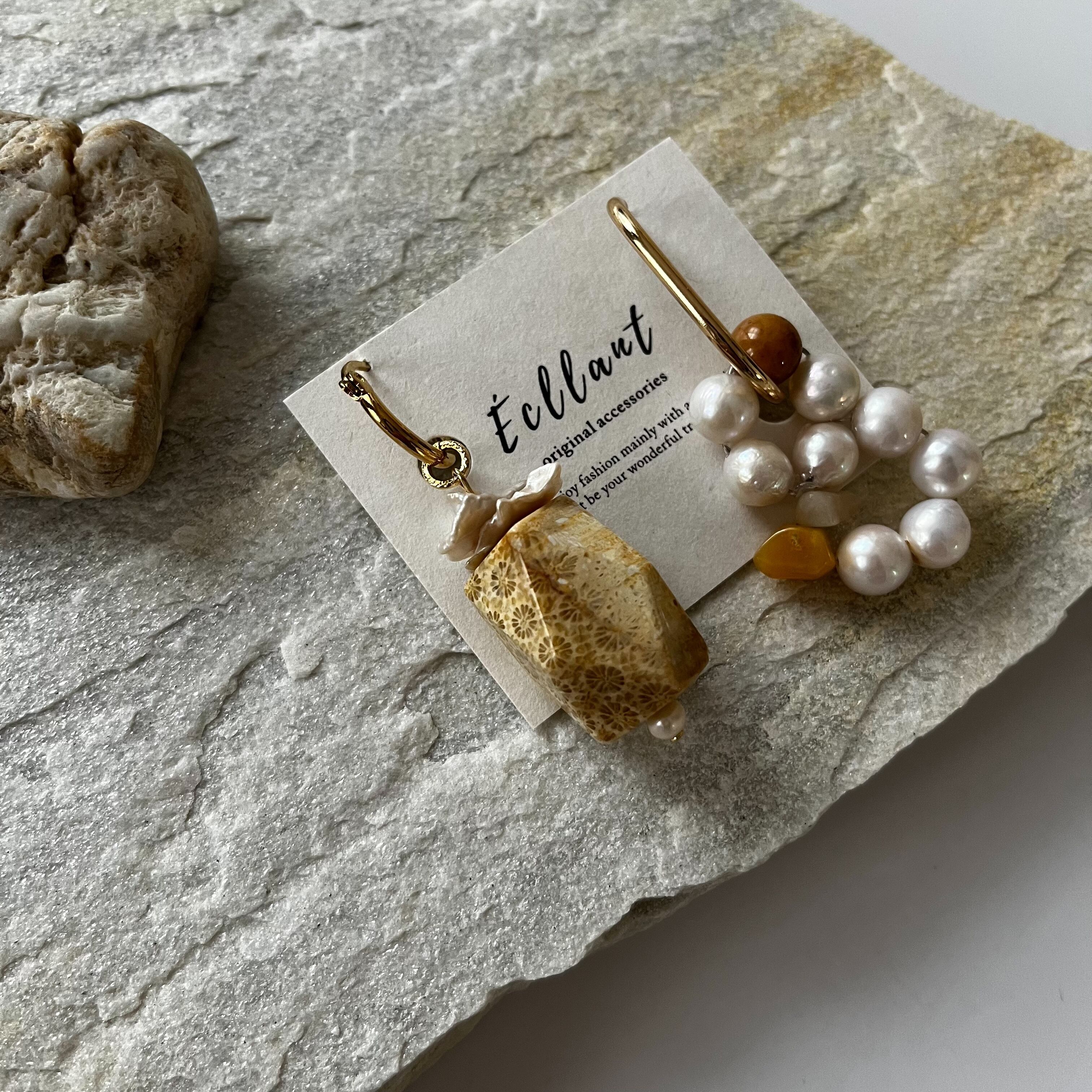 バロックパールや淡水パール×同一の色味の天然石を使用した春夏らしいアシンメトリーピアス。