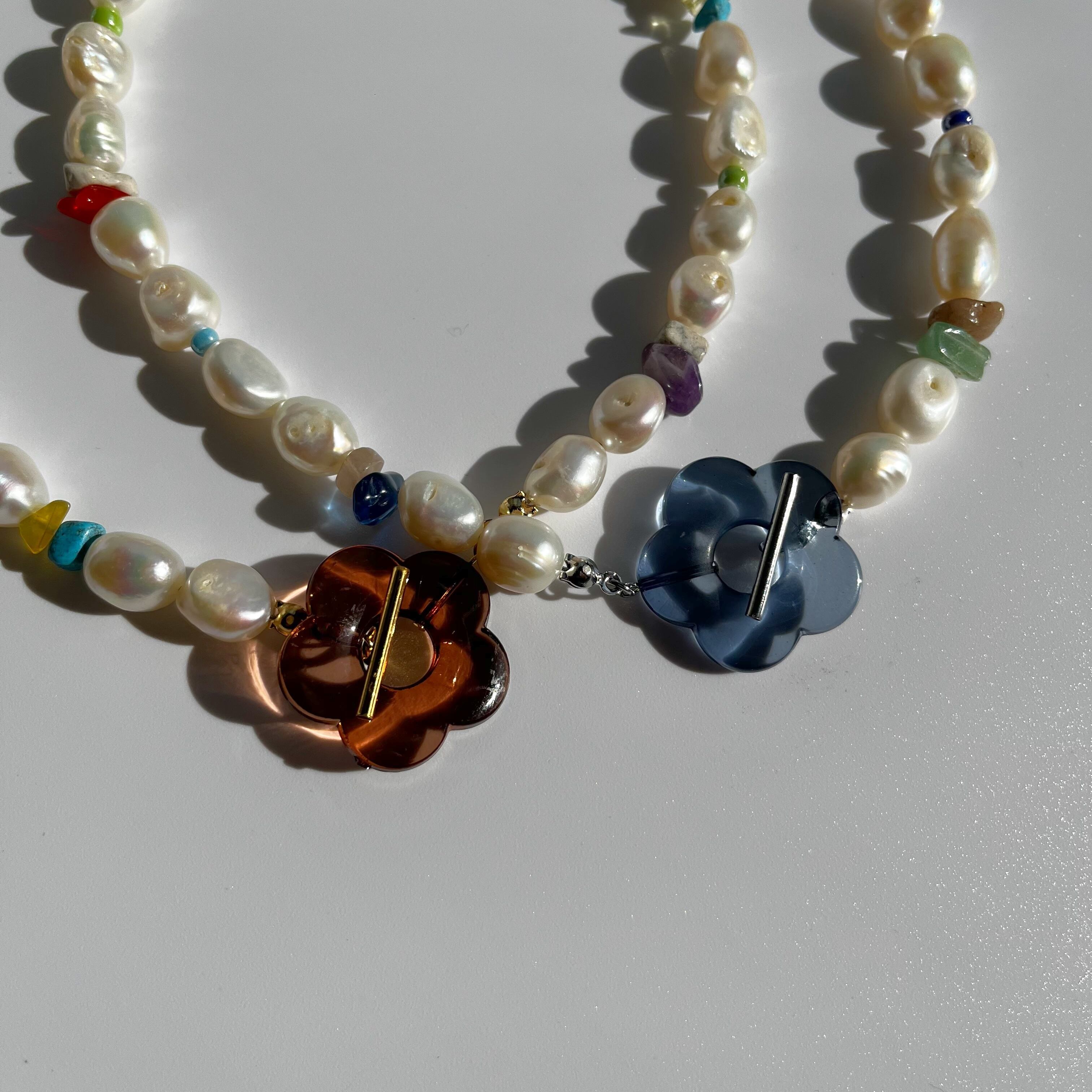 大粒の淡水パールと様々な天然石やビーズを使用したカラフルなデザイン♡