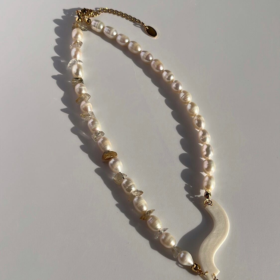 チェーンの先端には大粒のバロックパールを下げ