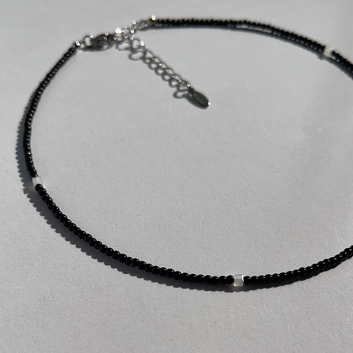 丸い小さなビーズに多面カットが施された正方形のホワイトビーズを4粒散りばめたシンプルなビーズネックレス ❤︎