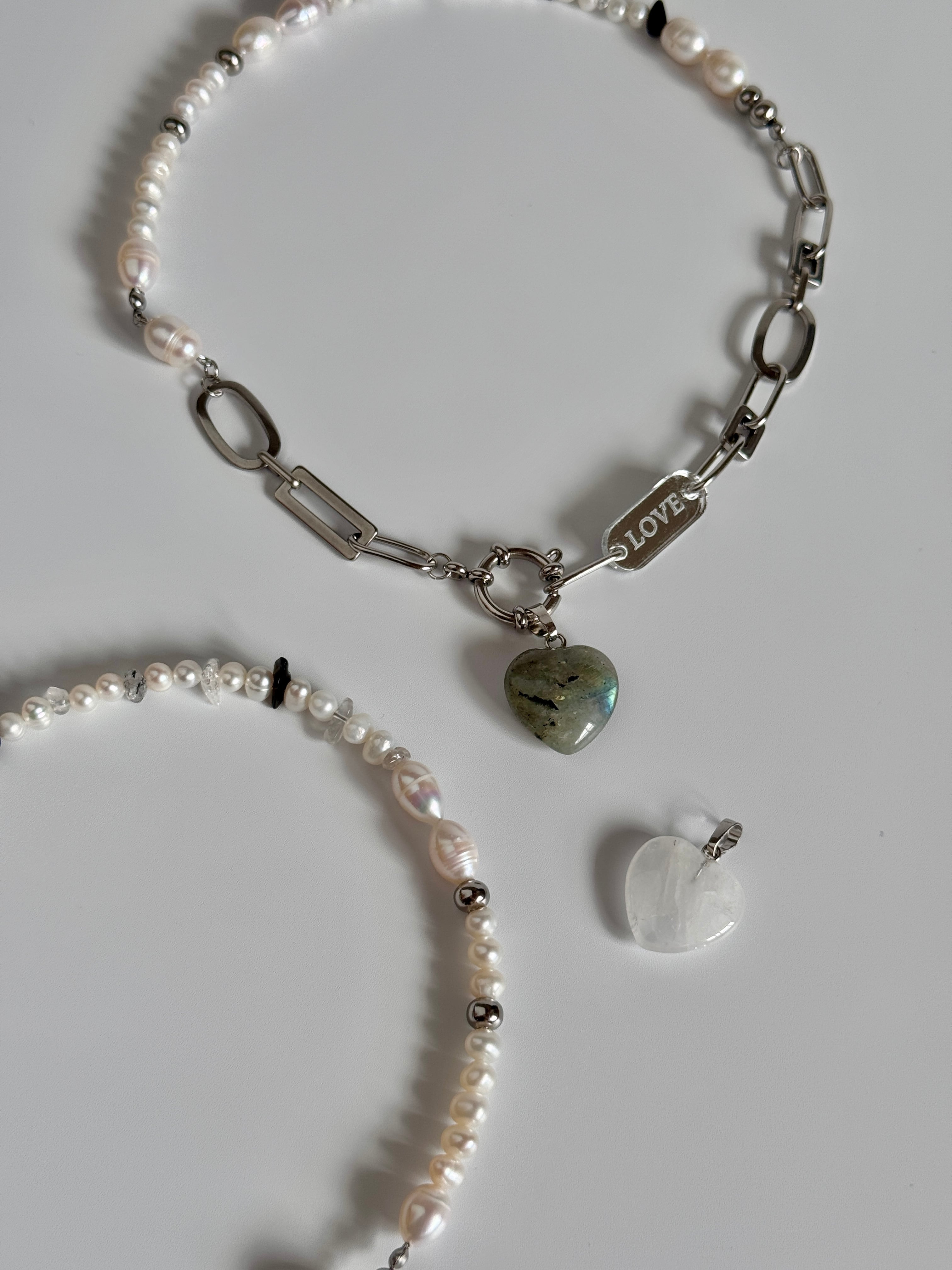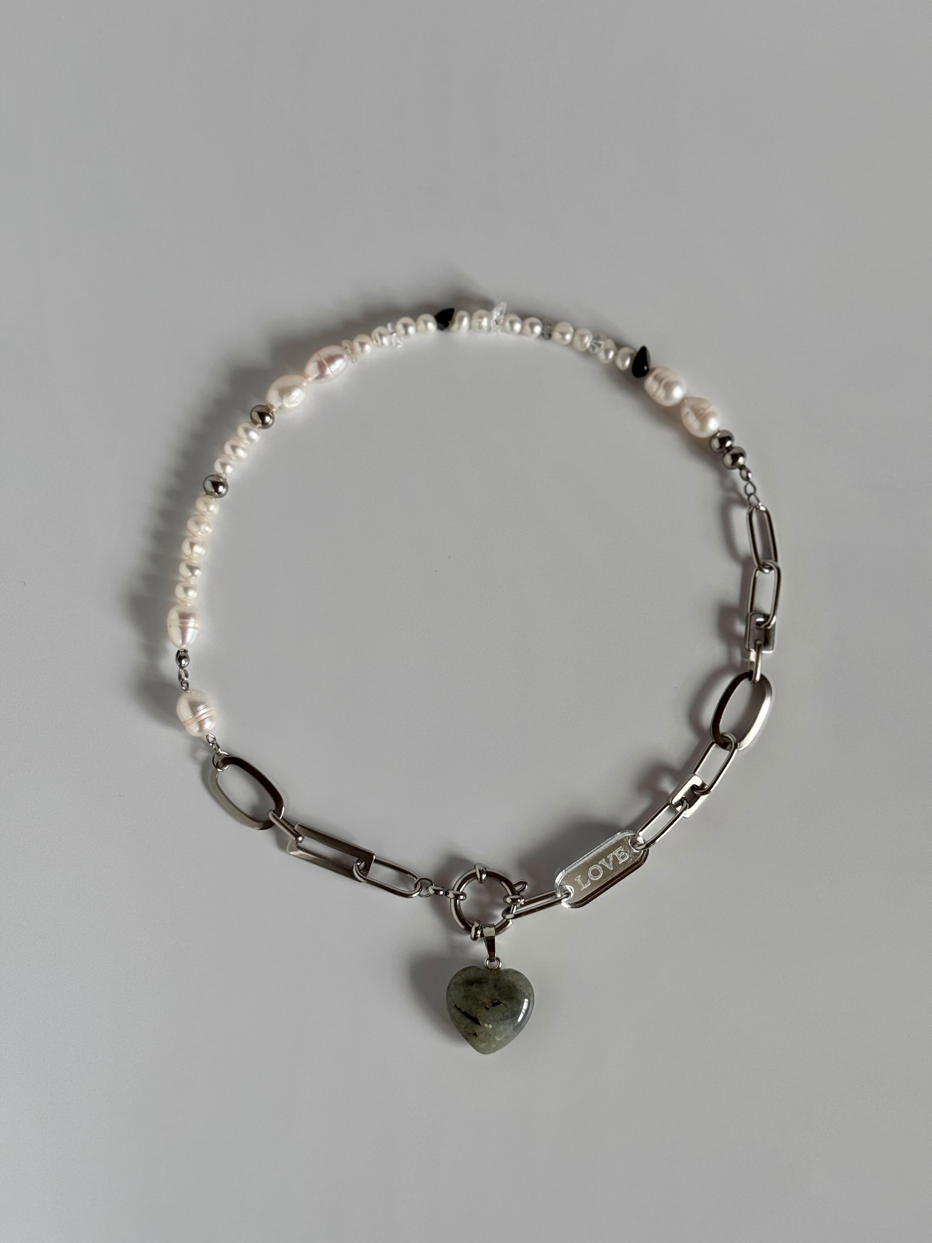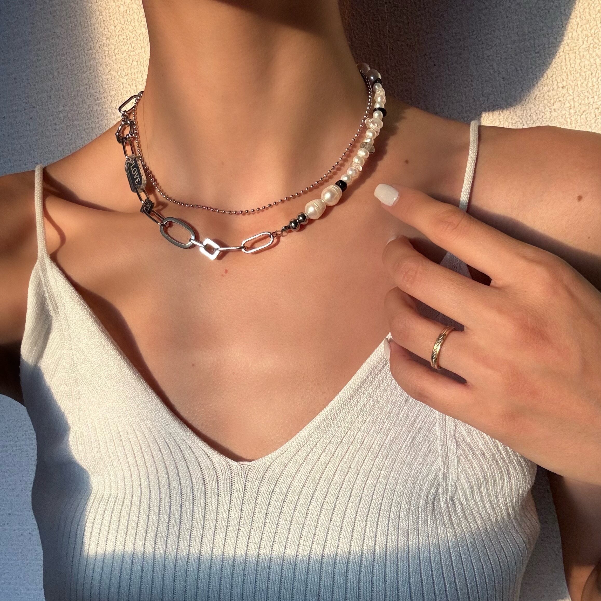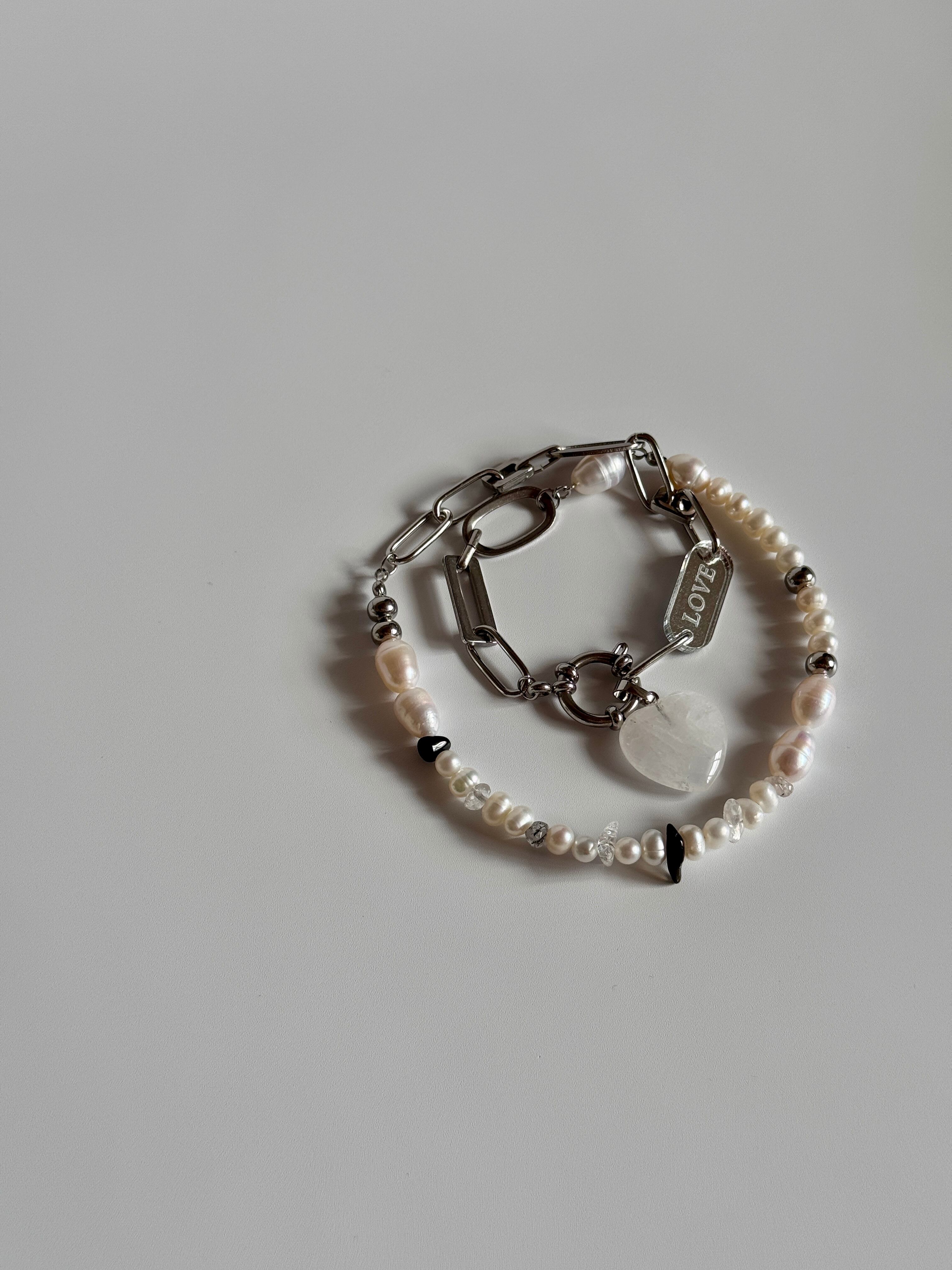 淡水パールとモノトーンの天然石を組み合わせ、