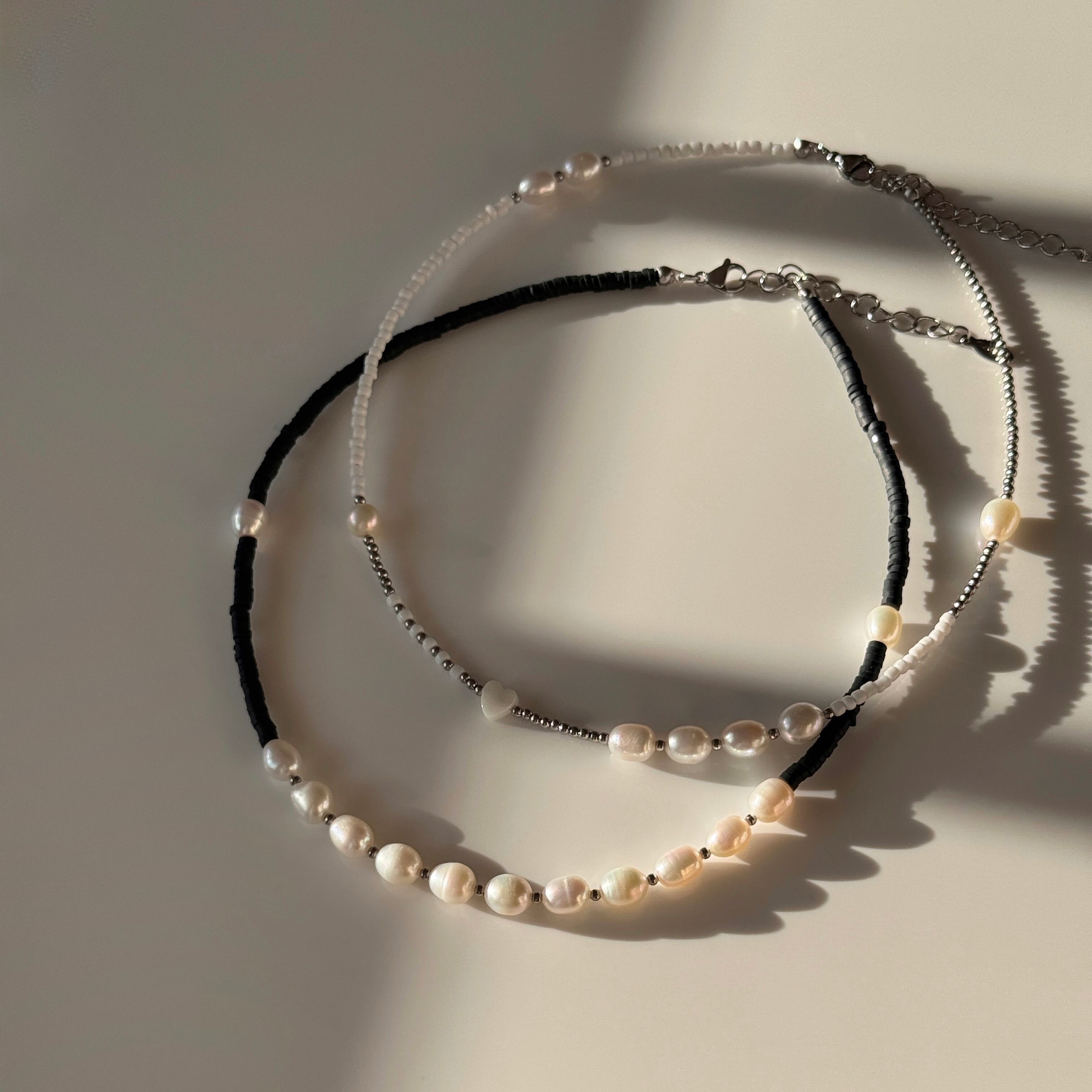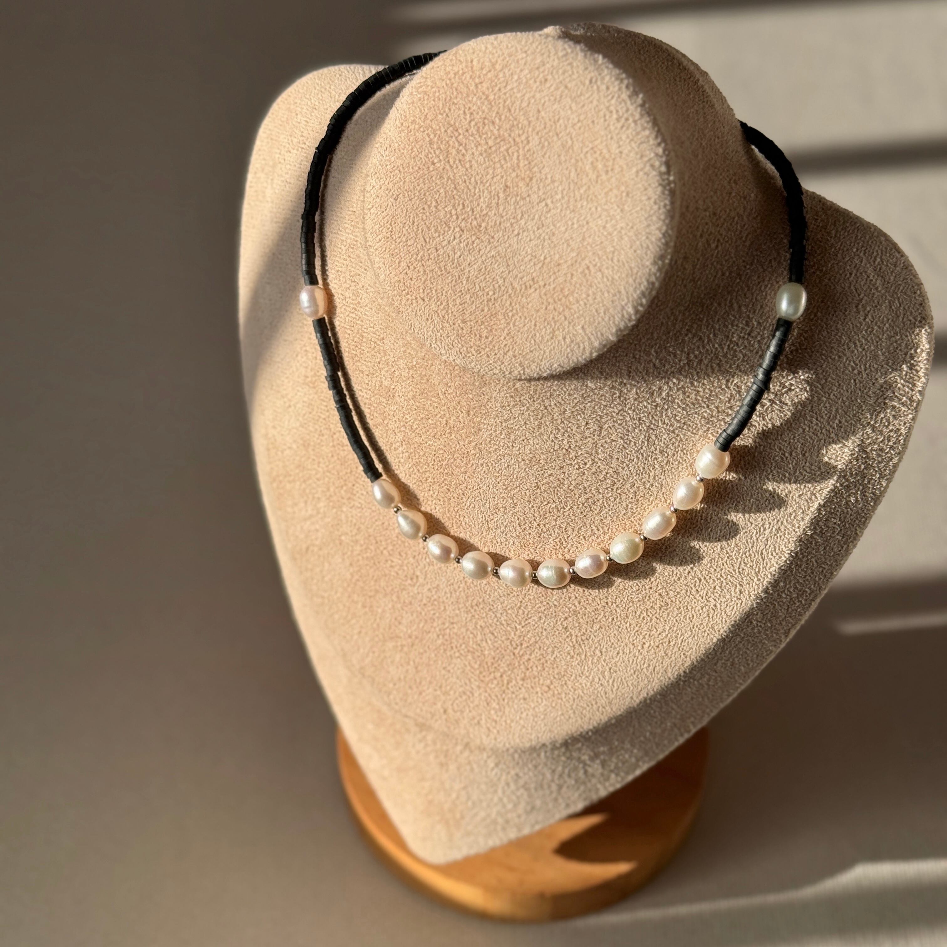 淡水パールとブラックカラーのビーズを組み合わせたモノトーンなデザイン